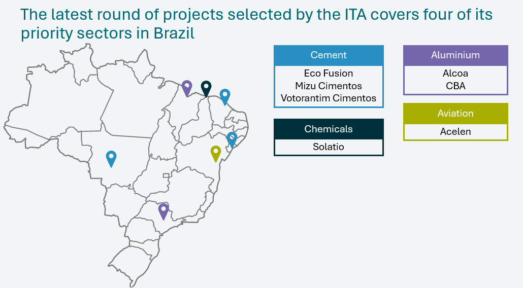Os sete projetos recém-selecionados abrangem uma diversidade de setores, localidades, tecnologias, tipos de projetos e maturidades, permitindo uma compreensão ampla e profunda dos desafios enfrentados por projetos no Brasil, o que permitirá ao ITA oferecer soluções inovadoras e personalizadas. Dos setores de produtos químicos e de aviação, os projetos representam grandes novas instalações que poderão produzir produtos com emissões significativamente menores em comparação com os equivalentes convencionais.